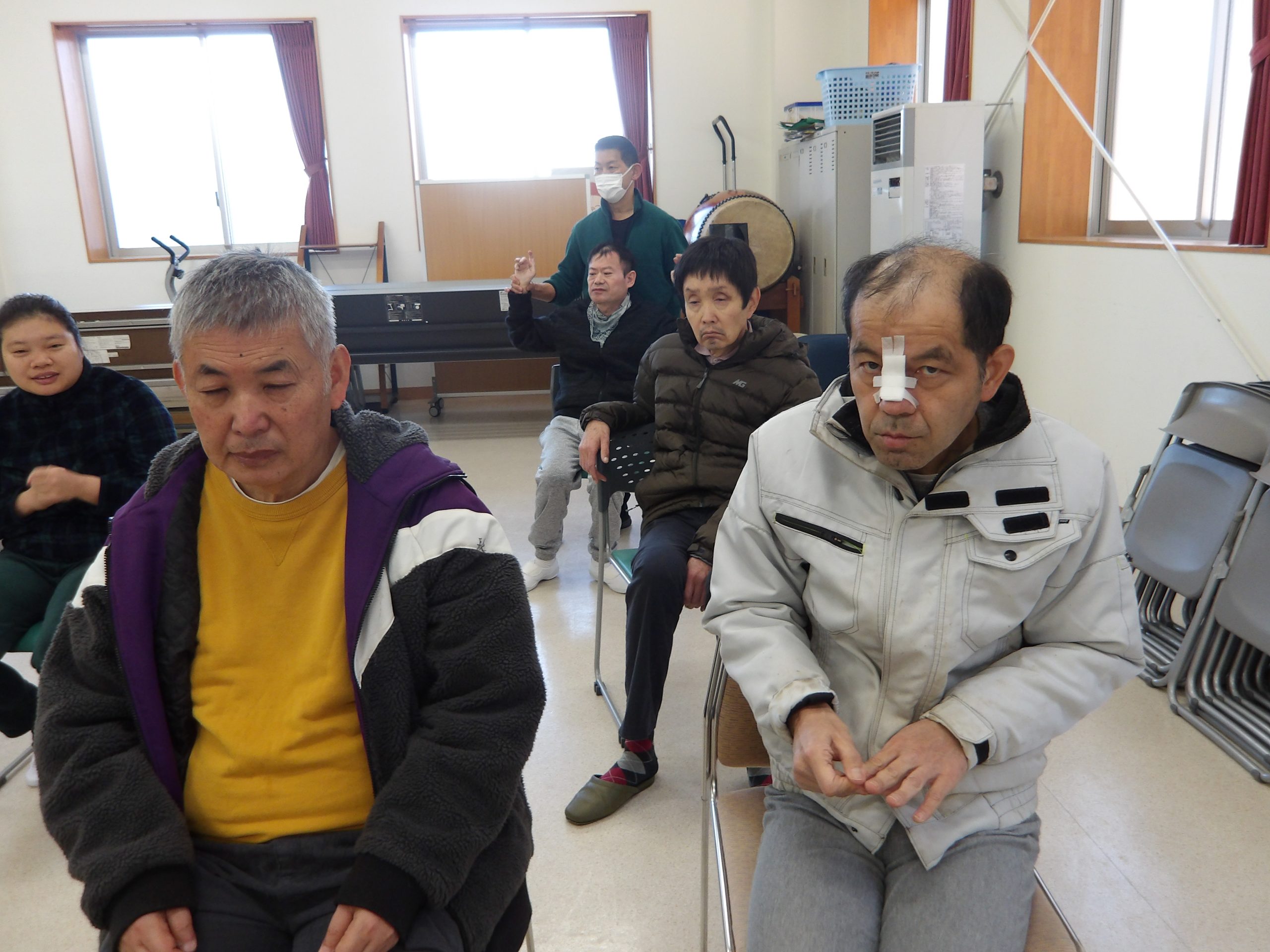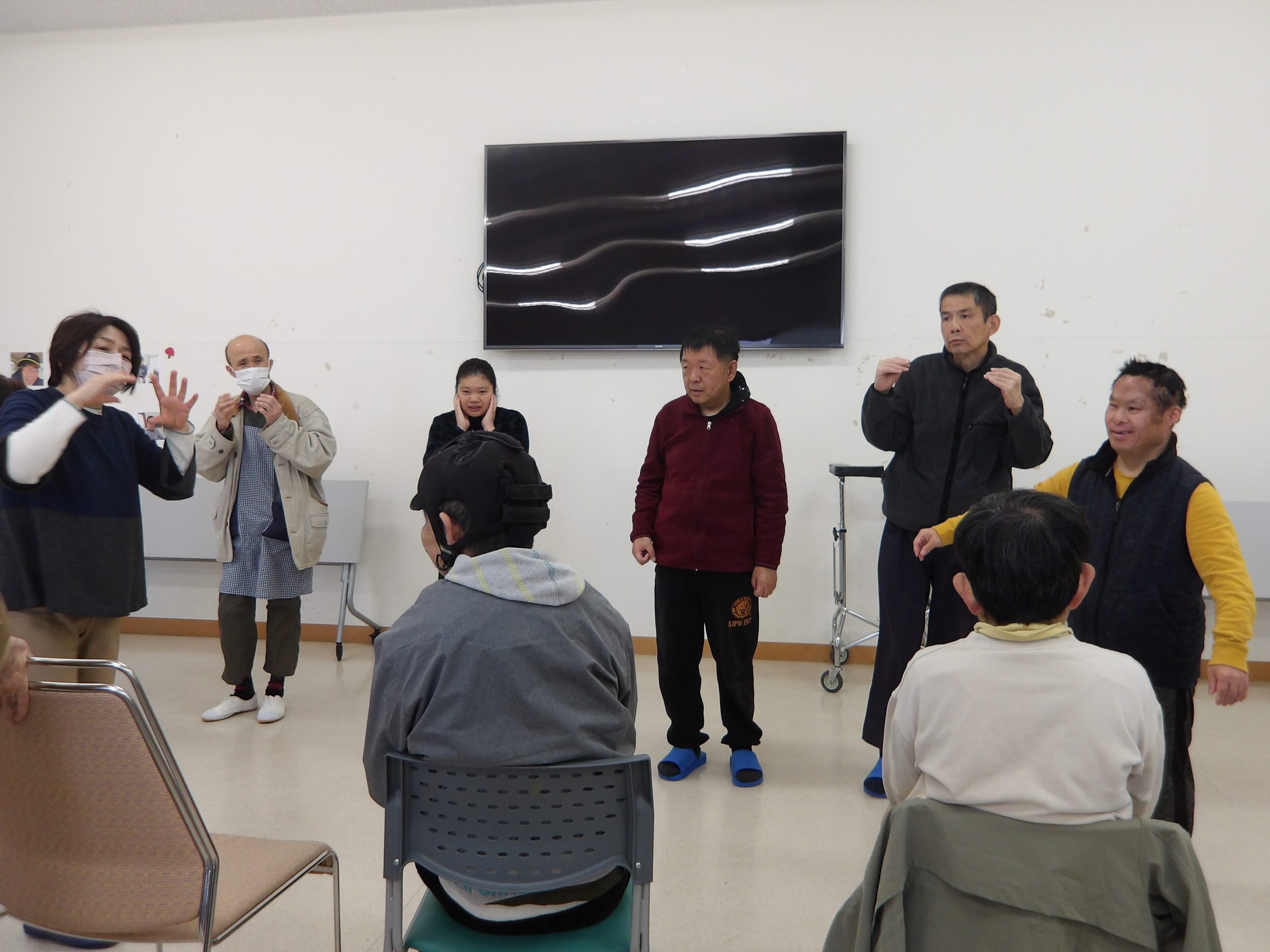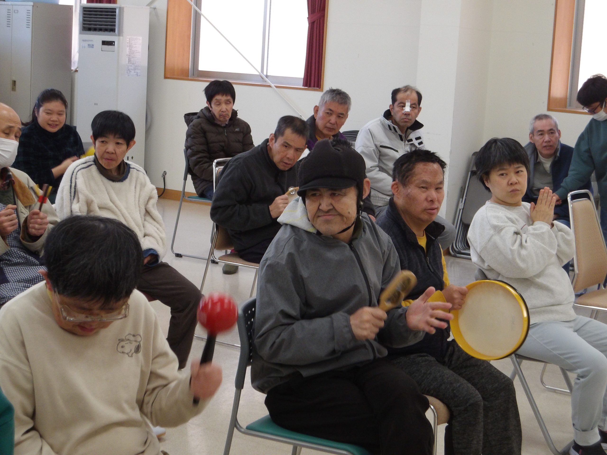 歌だけでなく、タンバリンやマラカスなどの楽器も演奏し、会場となった作業棟は暖かい空気が流れていました。
