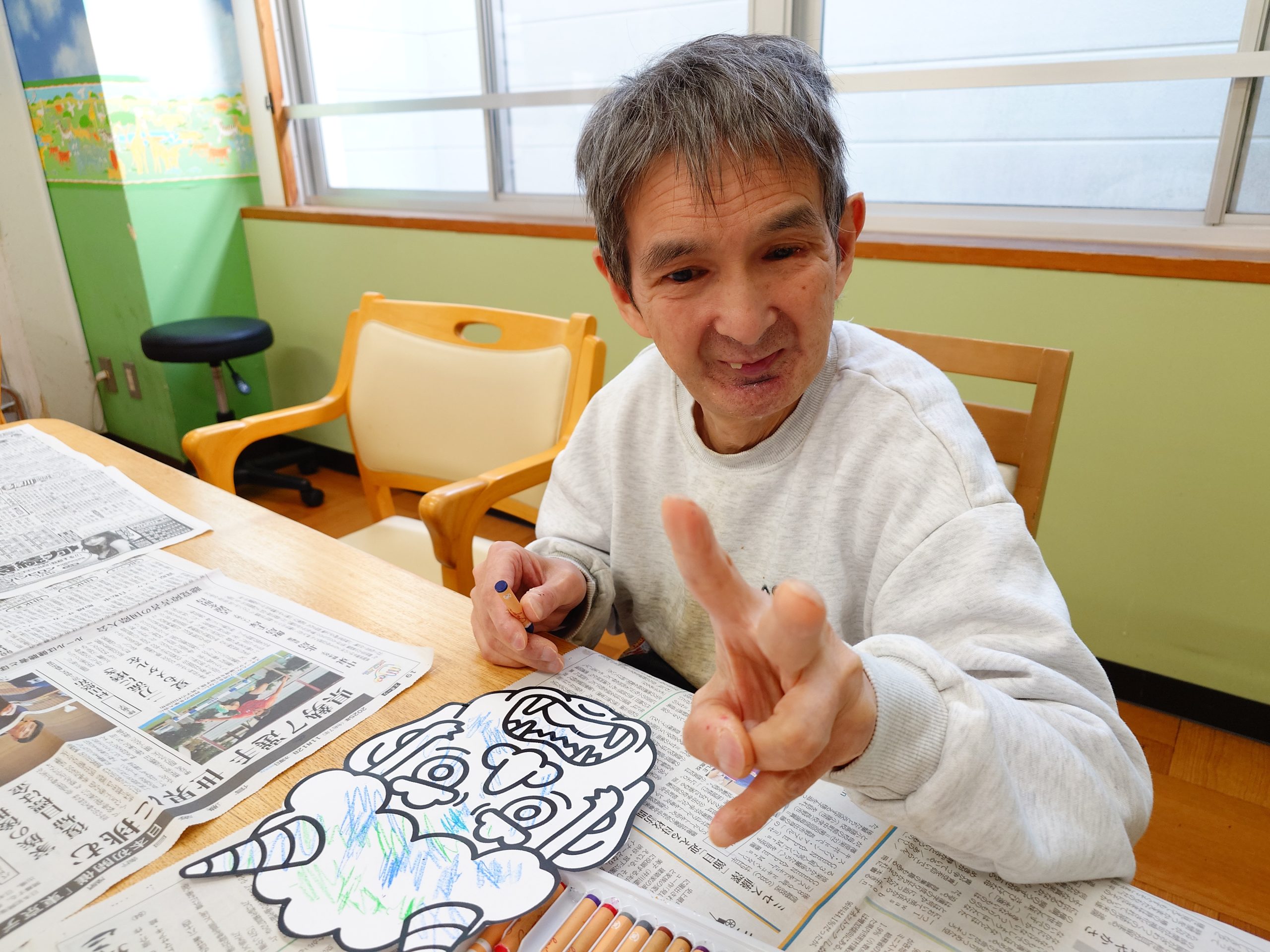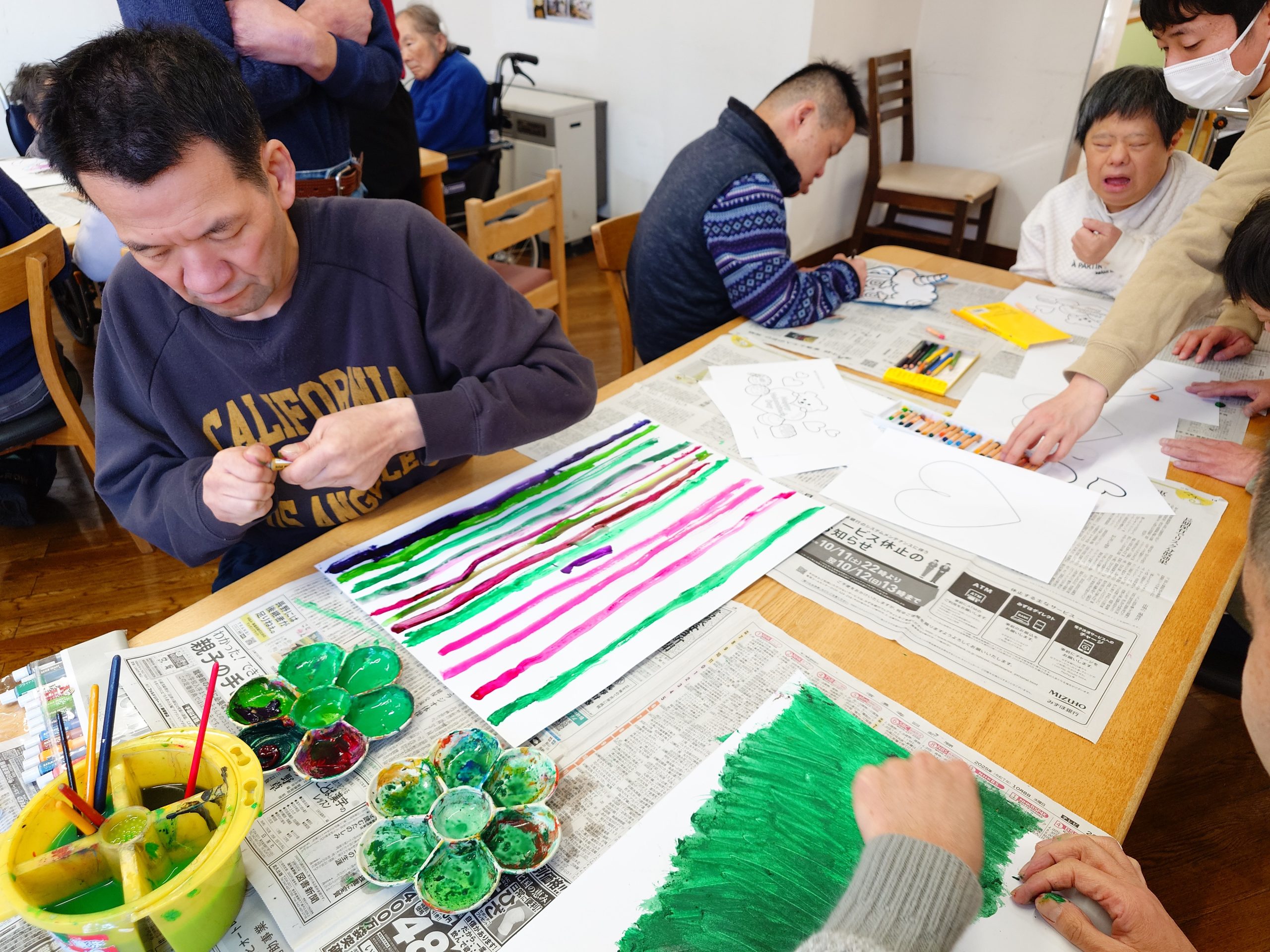 また、お面作り以外でも、画用紙に絵の具で絵を描いたり、