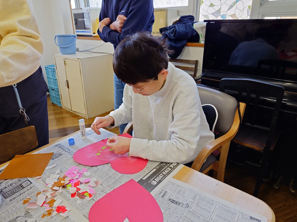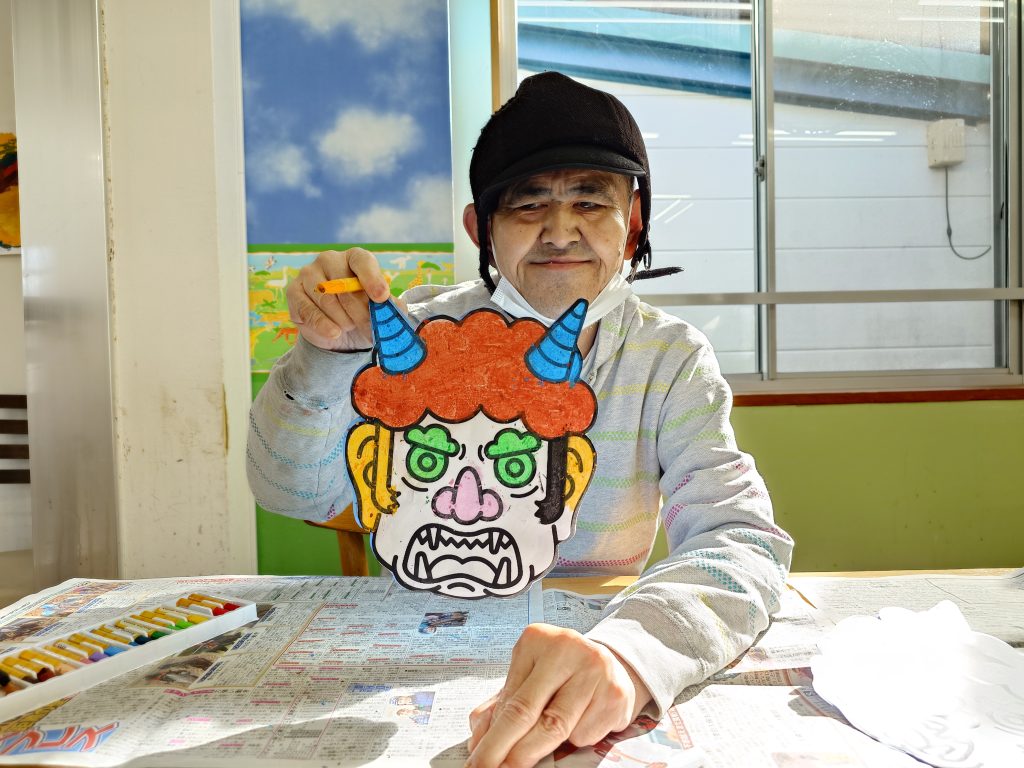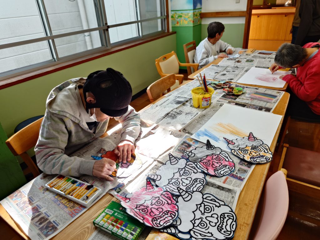 今回のアート作業では、節分の鬼のお面作りを行いました。