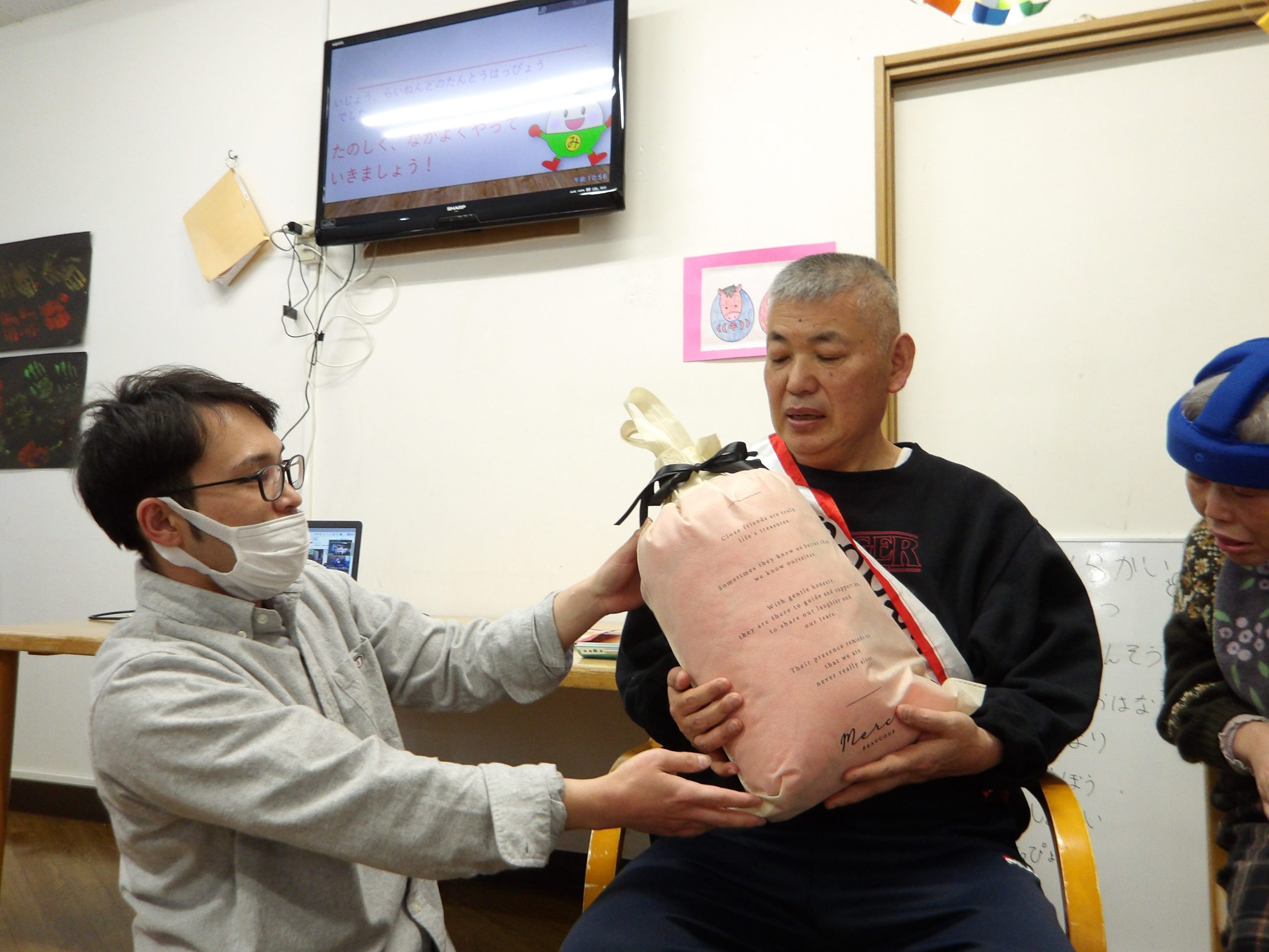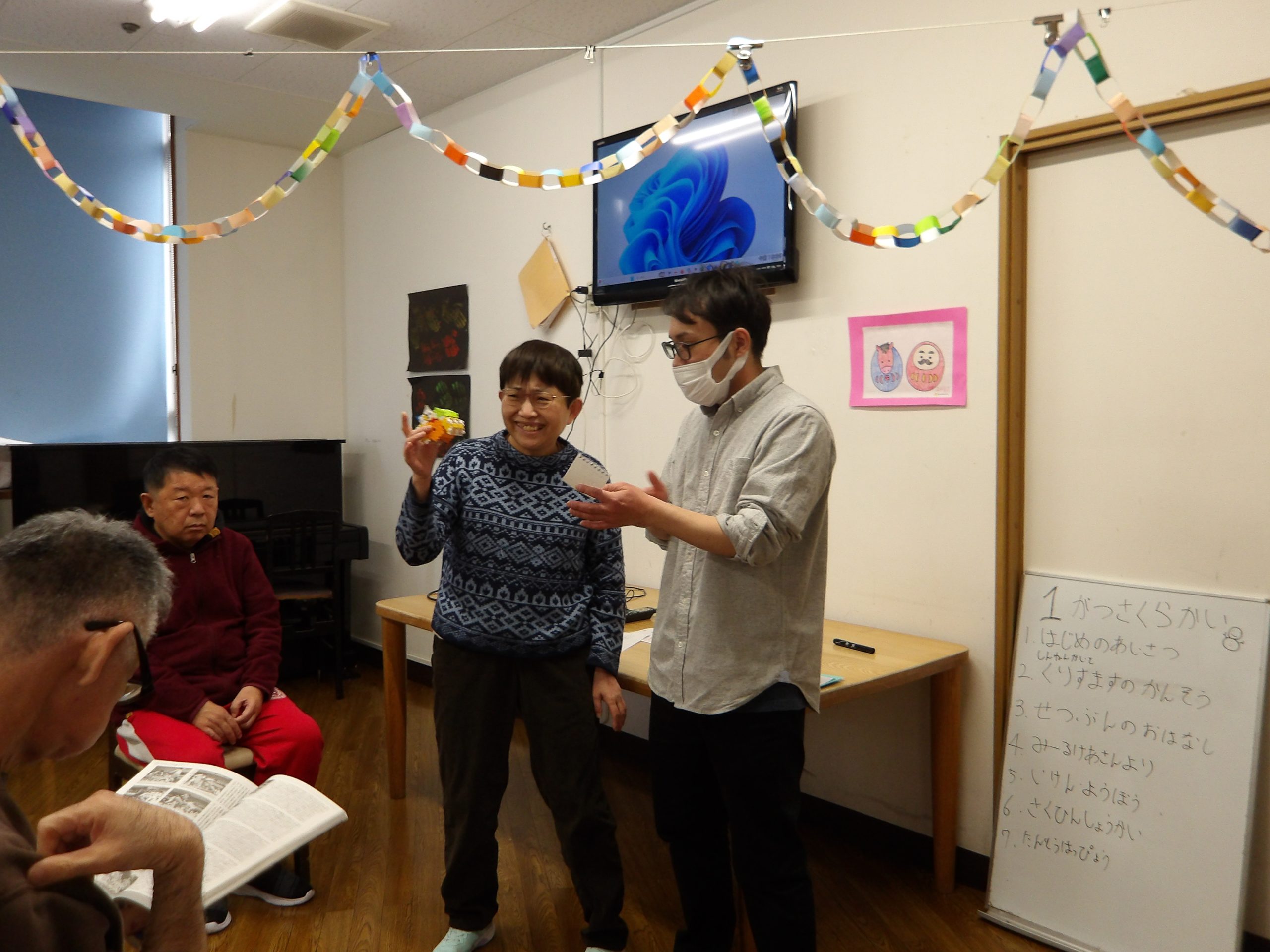さくら会の後はお誕生日会。今月は2名の利用者の方が誕生日を迎えられました。プレゼントをお渡しし、皆でバースデーソングを歌ってお祝い。