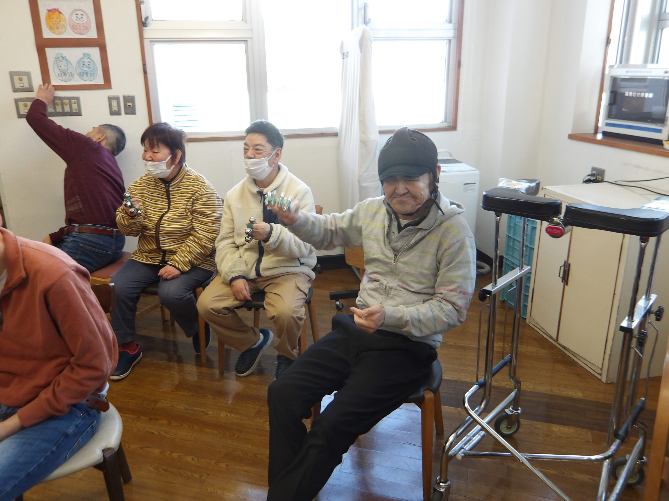午後の活動で音楽レクを行いました。食堂に集まり、歌を歌ったりすきな楽器を選び音を奏でるなど皆さんおもいおもいに楽しみました。皆さんの前に出て楽器を披露する機会もあり、たくさんの笑顔が見られました。