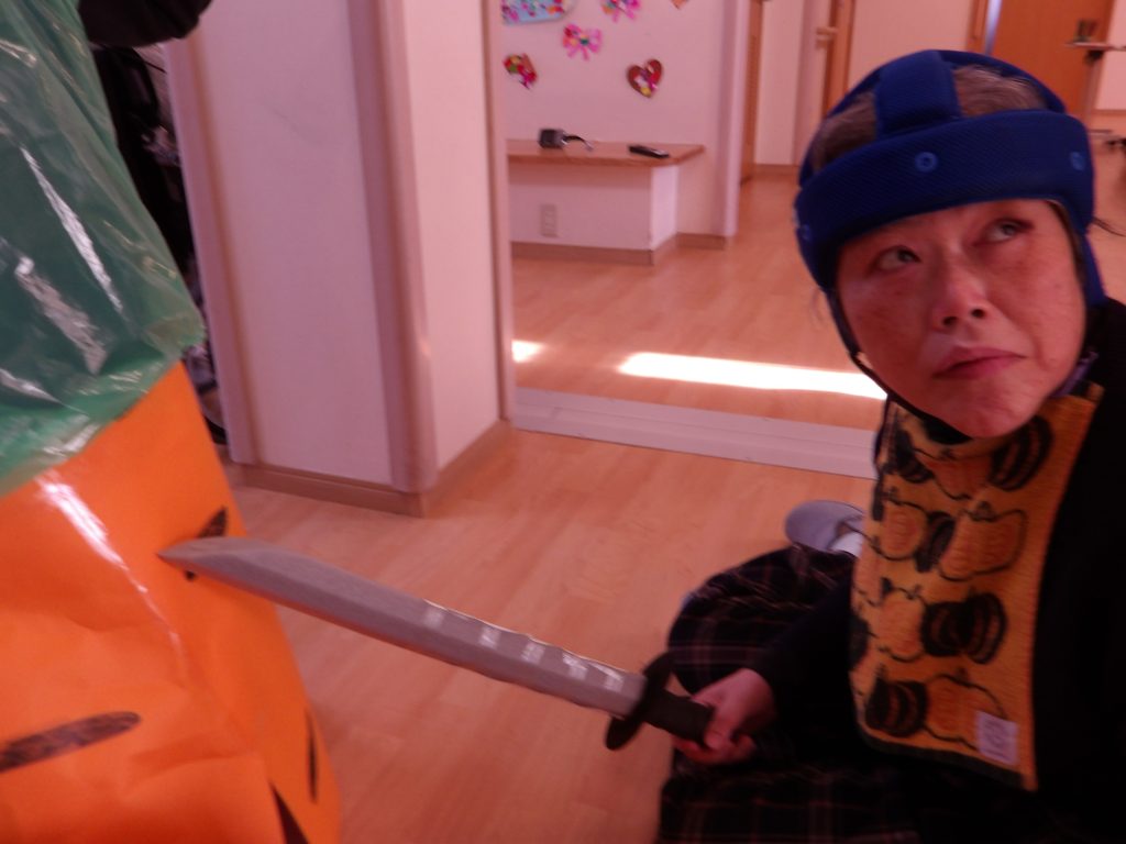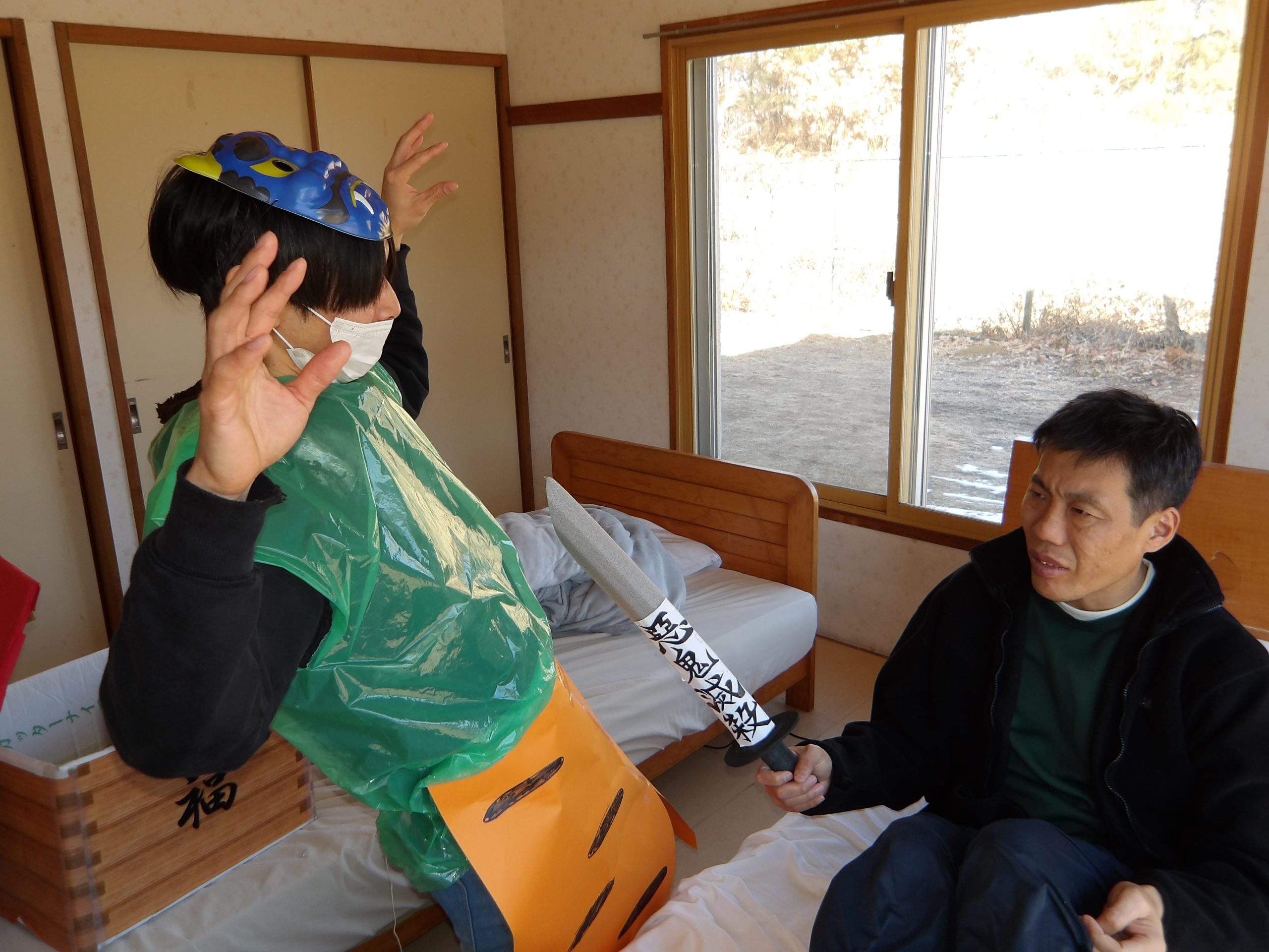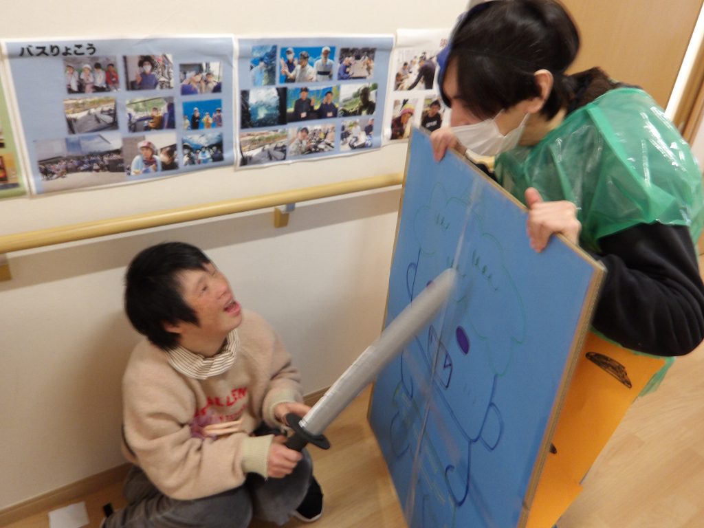 鬼に扮したスタッフに向かって、新聞紙で作った豆を皆で豆まき。